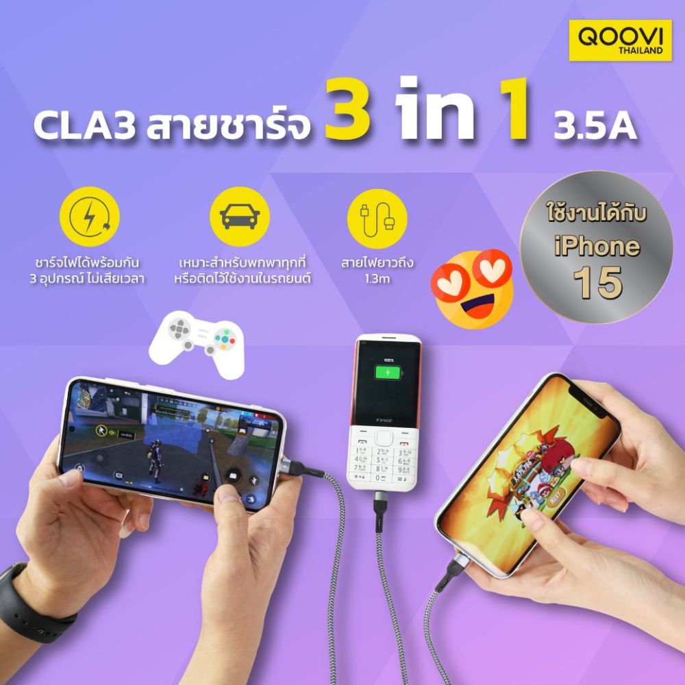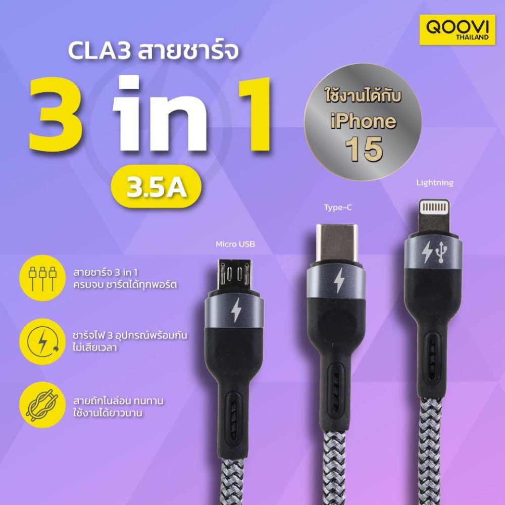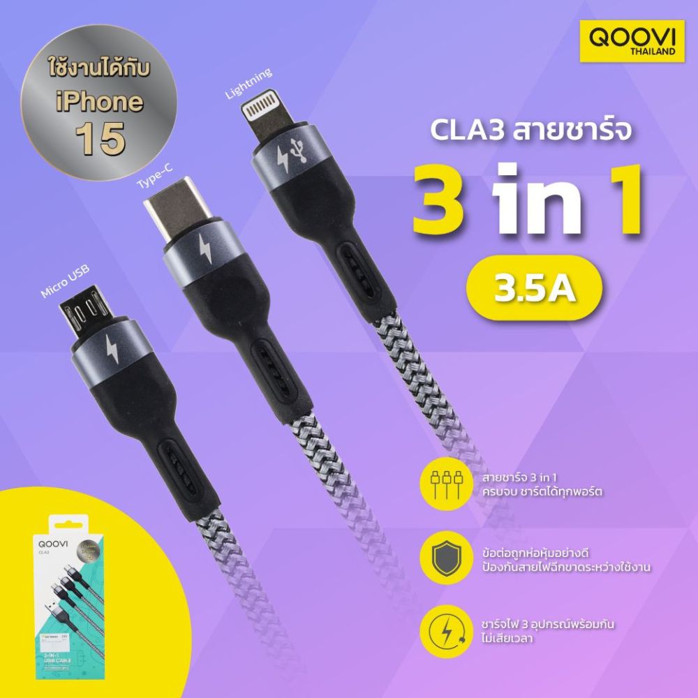 QOOVI สายชาร์จ USB 3in1 3.5A สายยาว 1.2 เมตร ชาร์จได้พร้อมกัน 3 อุปกรณ์ รับประกัน 1 ปี