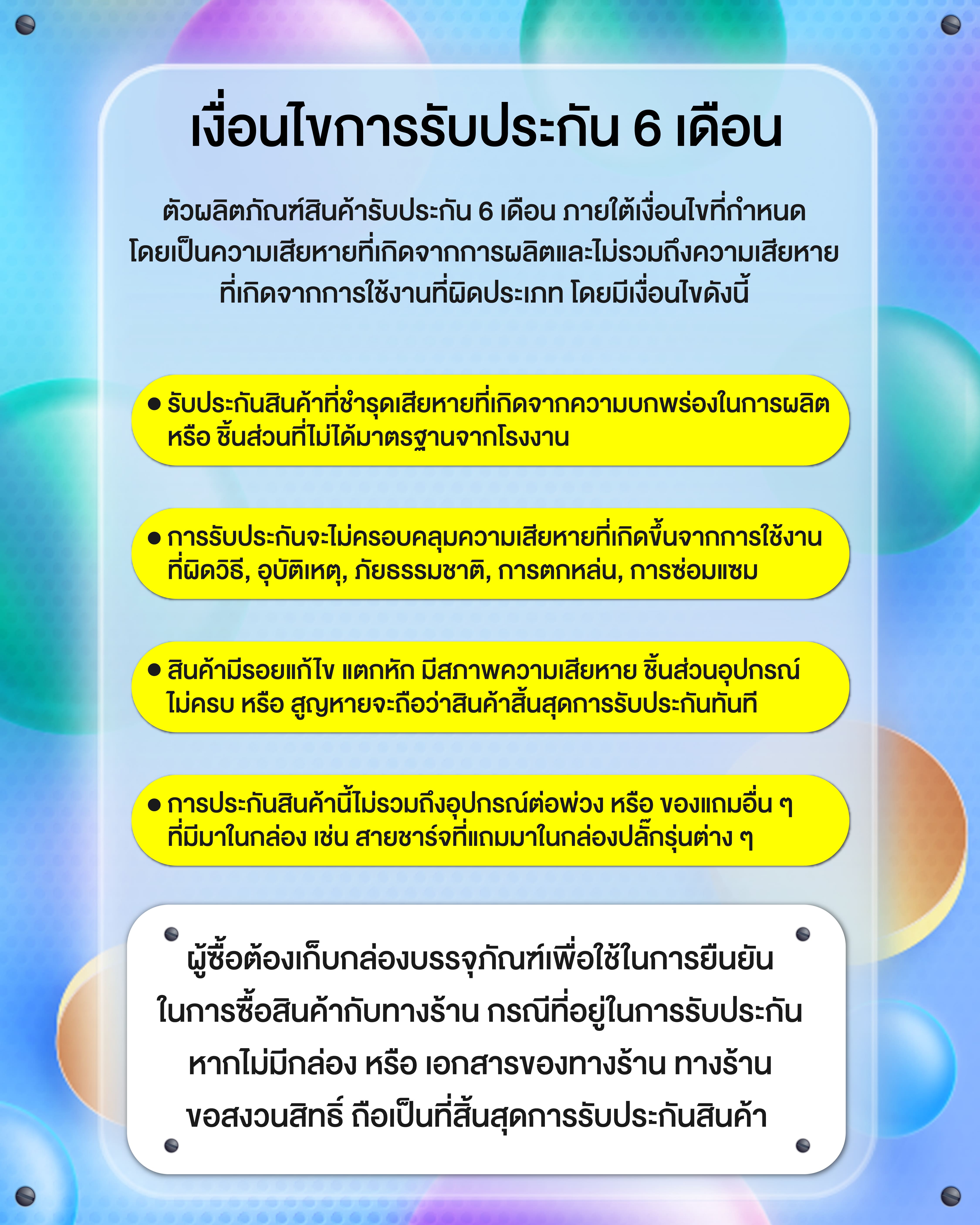 ตัวผลิตภัณฑ์สินค้ารับประกัน 6 เดือน ภายใต้เงื่อนไขที่กำหนด โดยเป็นความเสียหายที่เกิดจากการผลิตและไม่รวมถึงความเสียหายที่เกิดจากการใช้งานที่ผิดประเภท โดยมีเงื่อนไขดังนี้